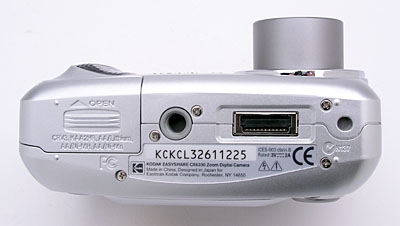 On the bottom panel of the CX6330 are the tripod mount, dock jack, and battery compartment. The threaded, plastic tripod mount is just off-center and too close to the battery compartment for quick battery changes while working with a tripod, but I suspect that most owners won't be bothered by this. The battery compartment features a locking, hinged door, which slides forward to open. The dock connection jack connects the camera directly to the optional EasyShare dock for quick image downloading.