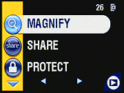 The rest of the camera controls are on the rear panel, along with the optical viewfinder and LCD monitor. A small, indented thumb rest on the right side cups your thumb as you hold the camera, working together with the front handgrip to provide secure purchase for your fingers. Above the thumb rest is the zoom rocker button, with the Flash and Drive buttons to its left. In the lower right corner are the Menu and Review buttons. On the opposite side of the LCD monitor, the Delete and Share buttons frame the top and bottom of the Four-Way Arrow pad, which navigates through menu screens. The optical viewfinder eyepiece is quite small, but has a fairly high eyepoint to accommodate eyeglass wearers (I could easily see the full frame when wearing my eyeglasses). Next to the viewfinder is a small LED lamp, which lights or flashes to indicate camera status (such as when focus is set, flash is charging, etc.).