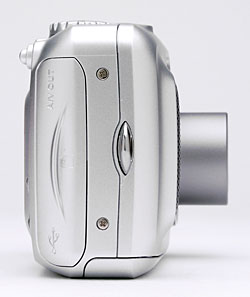 The telescoping lens takes up the right side of the camera's front panel, surrounded by a thick, plastic lip. The lens extends outward just shy of half an inch when the camera is powered on. A shutterlike lens cover automatically slides out of the way as well, and eliminates the need for a removable lens cap. Also on the front panel are the optical viewfinder window, flash, light sensor, self-timer lamp, and a tiny microphone. A gently-sculpted finger grip on the side of the camera features a textured pad for fingers to cling to.