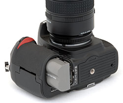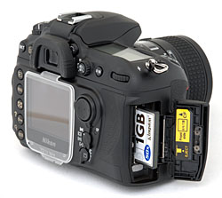 Nikon still hasn't decided what mechanism to use for their CF card doors. The D2x, D70, D50, and D200 all have different designs. Each is just fine, but I like the D200's because it is practical, seals well, and its mechanism is sure in both directions. You cradle the camera in your left hand, swing the release switch on the back of the camera, and the door swings open from the right. It opens swiftly, but with a soft sound, because there's a large rubber bumper on the inside of the hinge area to catch it. When it closes, the door mounts flush, and it cannot be opened accidentally like some other designs.