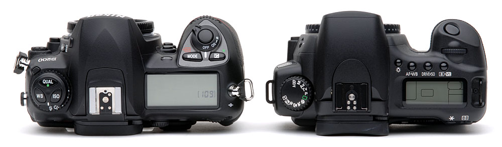 Like the 20D, the Nikon D200 is solid as a rock and about as heavy. In my experience, a camera with some substance helps me take steadier shots, so I like cameras with some heft. Both cameras have a magnesium alloy body, with the D200 weighing about 145 grams more than the 20D (body only; about 5 ounces). The D200 is also bigger than both the 20D and D70, albeit not by very much. The extra weight is offset by a well-balanced body and a superb grip.
