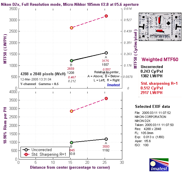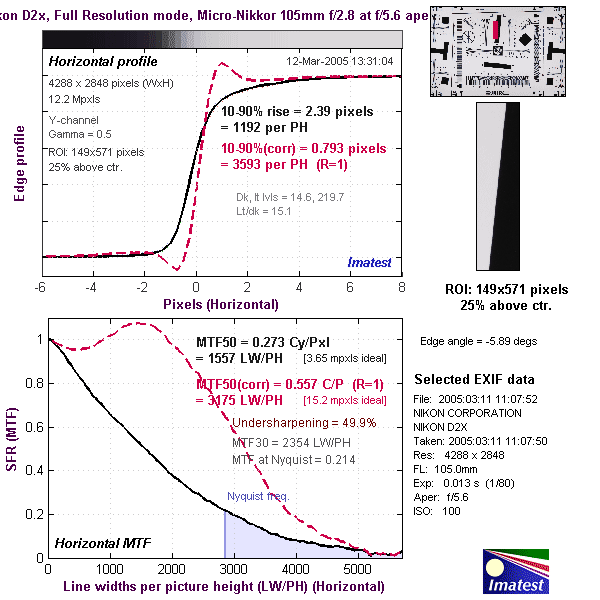 We can see what's going on if we look at the actual intensity profiles across an abrupt edge in a subject. The plot below shows the results for a vertical edge (and therefore, the resolution along a horizontal axis), taken from the ISO 12233 resolution target. What we find is that the default sharpening applied by the camera results in zero overshoot across the edge. (The black line in the graph below.) This means there are no sharpening artifacts to be found in the D2x's images, which in turn means that its files will take post-capture sharpening in software unusually well. The results of the standard 1-pixel sharpening operator applied by Imatest are plotted in red, showing the small over/under-shoot that you'd normally aim for in final image files, to maximize the perceived sharpness without obliterating fine detail. You can also see how extremely abrupt this modest sharpening makes the actual black/white transition, which is what produces the unusually high MTF 50 numbers in Imatest's output.