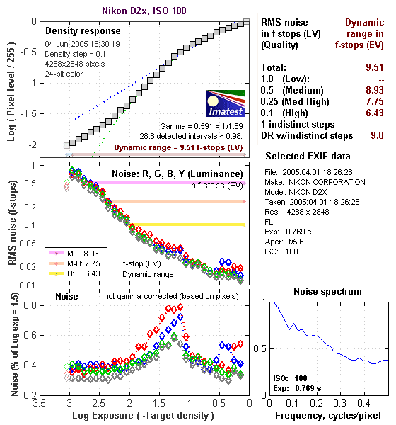 Now that it fully supports the 13-stop Stouffer 4110 transmissive step scale, I've begun using Imatest to study dynamic range in cameras. The D2x is the first for which I'll be sharing results from the program, and it's a great one to lead off with, given its excellent dynamic range performance.