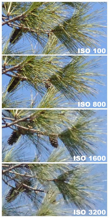 With that in mind, let's look at some crops from the same pine tree subject shown above, showing what happens as we go from ISO 100 to 3200: