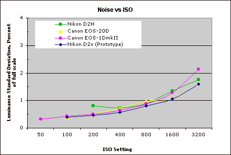 Since we're talking about high ISOs, this is probably a natural place to look at the Nikon D2x's image noise characteristics. Perhaps thanks to its CMOS sensor, I found its images to be very clean, with very low noise levels, at least at lower ISO values. Here's a graph of how its noise-vs-ISO curve stacks up against some of the competition: