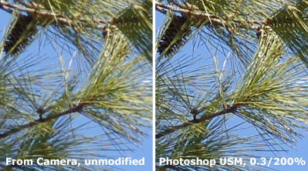 My immediate impression was "That's a lot of resolution!" - The Nikon D2x's images showed a lot of fine detail, and held together very well at the 13x19" print size. I did feel though, that fine details were a tad soft, so took a look in Photoshop, to see how they responded to unsharp masking. What I found there was even more impressive - Using a radius of 0.3 pixels and strength of 150-200% revealed a lot of additional detail beyond what was first apparent. It appears that Nikon has been very conservative with the in-camera sharpening in the D2x, with the result that its images take post-capture sharpening very well. (More on this later.) Here's an example of what I saw, the crop on the left being untouched, directly as it came from the camera, the one on the right having been unsharp masked in Photoshop, at 0.3 pixels/200%. (By the way, this image was shot at a range of about 75 feet, using my Micro-Nikkor 105mm f/2.8 macro lens at f/8. This is an excellent lens with exceptional sharpness and practically zero distortion. I use it for any critical sharpness analysis with Nikon-mount d-SLRs.)