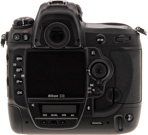 Nikon D3 Back View. More changes have come to the rear of the Nikon D3, but controls should still be familiar. A major change is a fairly simple one: the introduction of a button in the center of the navigation disk now has a button, making it easier to press. The AE/AF Lock button has been moved down some, as well, making it easier to distinguish from the AF-ON button, yet still accessible.