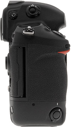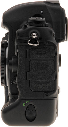 Nikon D3 Left View. The battery unlocks with a twist and pull to the left. Rubber flaps cover the camera's electrical ports, and a metal strap ring hangs from a steel lug just off the Nikon D3's left shoulder.