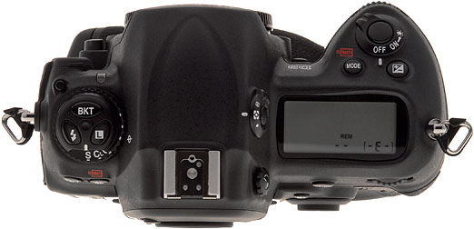Nikon D3 Top View. Buttons are reshaped and nudged around a bit when compared to the D2x, but overall placement is the same.