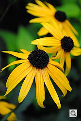 Oversaturated. Captured on a dreary day, I'm pleased that these black-eyed Susans and the leaves behind them are so vibrant, but that's not what the scene looked like.