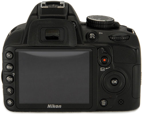Back View. The Nikon D3100 adds a Live View switch as well as a dedicated Movie Record button above the multi-controller. Also new is a dedicated i (Info Edit) button. The diopter adjustment is now a dial instead of a slider. A speaker grill can be seen below the multi-controller.