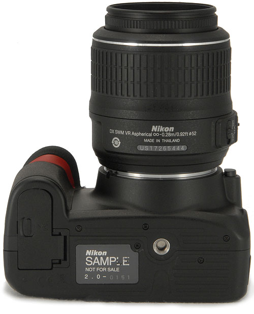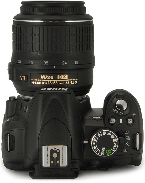 Top View. Here, we can see the new Drive Mode switch jutting out from below the mode dial. It allows the D3100 to be quickly switched between Single, Continuous, Self-Timer, and Quiet Shutter Release modes without needing to resort to the camera's menu system.