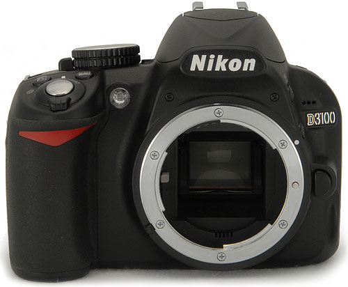 Front View. Compared to the D3000, the Nikon D3100's grip is deeper and the front adds a microphone in the upper-right shoulder for recording monaural audio with videos. Gone from the D3100 is support for an infra-red wireless remote, in favor of a wired remote control.