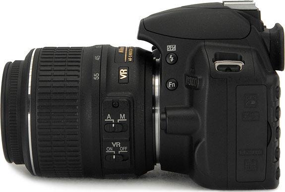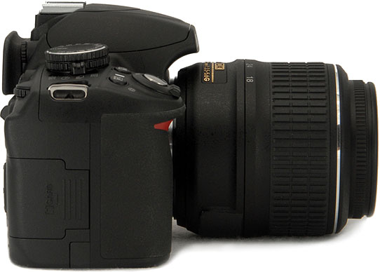 Left View. Shown here with the Nikkor AF-S 18-55mm f/3.5-5.6 VR kit lens, the Nikon D3100 adds an Accessory port for connection to an external GPS unit or a cable remote. A mini HDMI output port is also provided, with CEC (Consumer Electronics Control) support allowing playback control via a TV remote control from compatible TVs. The Function button no longer doubles as a Self-timer button, as that function has been moved to the new Drive Mode switch on the top panel.