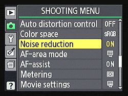 Noise Reduction. The Nikon D3100 offers noise reduction, but with only two options: Off or On. This control affects both high ISO and long exposure (dark current) noise reduction simultaneously, so it isn't possible to disable only one noise reduction type. Nikon doesn't state at which sensitivities the D3100 performs noise reduction, but does note that even when set to Off, some high ISO noise reduction will still be performed at higher ISOs. Long exposure noise reduction doubles the exposure times, as it functions by capturing a second image with identical settings to the actual exposure, but with the shutter closed. This generates a picture of the dark current noise, which varies as a function of sensor temperature and exposure time, allowing the locations of dark current pixels to be mapped and automatically removed from your final image. If you're shooting a long exposure, and forget to disable noise reduction before the fact, you can prevent the camera from applying dark current noise reduction by switching the D3100 off during the dark current exposure, after photo exposure has been completed. You can then immediately power the camera back on and resume shooting or review your captured image.