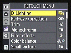 Retouch Menu. The Nikon D3100 has an extensive Retouch menu, replicating almost all the options from the D5000, and adding a basic movie editing function. The amount of image alteration that can be performed in-camera is starting to rival what basic image editing software packages can do on a computer, so much so that many users may not feel the need to use a computer for Nikon D3100 image editing at all. Retouch options include adjusting D-Lighting, red-eye correction, image cropping (trim), converting to monochrome, applying seven different filter effects, adjusting color balance, resizing to small images (for TV, Web or email), image overlay for combining two RAW images into one JPEG, NEF (RAW) processing, "Quick Retouch" for fast adjustments to saturation and contrast, straightening crooked images, distortion (barrel / pincushion) correction, a fisheye effect, color outline, perspective control (correcting diverging verticals / horizontals), miniature effect (graduated blur at top and bottom of the frame to emulate reduced depth of field), and basic movie editing.