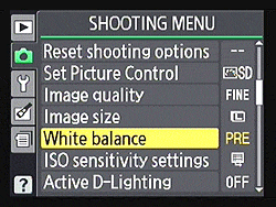White Balance. The Nikon D3100 offers the usual white balance settings: Auto, six presets consisting of Incandescent, Fluorescent, Direct Sunlight, Flash, Cloudy, Shade, and a manual mode where white-balance is determined from a white or grey card. The Fluorescent preset has seven sub-settings consisting of Sodium Vapor (2,700K), Warm-white (3,000K), White (3,700K), Cool (4,200K), Day White (5,000K), and High Temperature Mercury Vapor (7,200K), and the Preset Manual setting allows one custom white-balance measurement to be stored. All the presets are tweakable via a 2D fine-tuning grid display, but the Manual setting can't be tweaked.