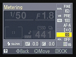 A very nice touch that's common to other Nikon DSLRs is that, while in Program AE mode, you can rotate the Command dial to select different combinations of aperture and shutter speed settings than those normally chosen by the autoexposure system. (That is, if the automatic program would have chosen 1/125 second and f/5.6, you could instead direct the camera to use 1/60 at f/8 or 1/30 at f/11, to get greater depth of field.) Dubbed Flexible Program in Nikon parlance, this is a very handy option for those times when you need some measure of increased control, but still want the camera to do most of the work for you. We personally use this capability more than Aperture- or Shutter-priority metering in our own shooting.