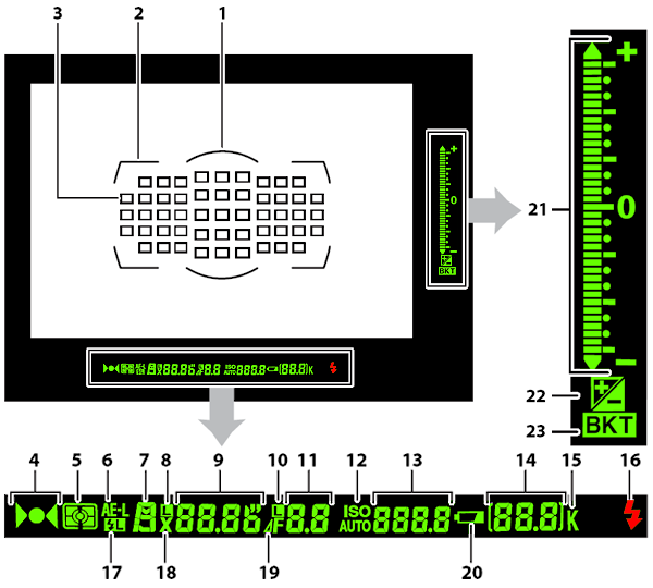 The graphic and table below shows what information is displayed in D3X's viewfinder.
