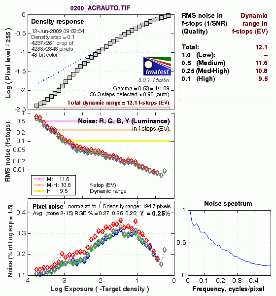 In comparing these graphs with those from competing cameras, I've found that the Noise Spectrum graph at lower right is the most important. Cameras that manage to shift their noise spectrum to higher frequencies have much finer-grained noise structures, making their noise less visually objectionable. In the graph above, this would show up as a noise spectrum curve that remained higher on the right side, representing higher noise frequencies. The champion at this was (and still is) the Canon EOS-1Ds Mark II, which produced remarkably fine-grained image noise, even at very high ISOs.
