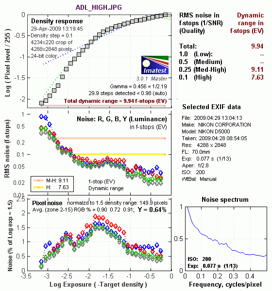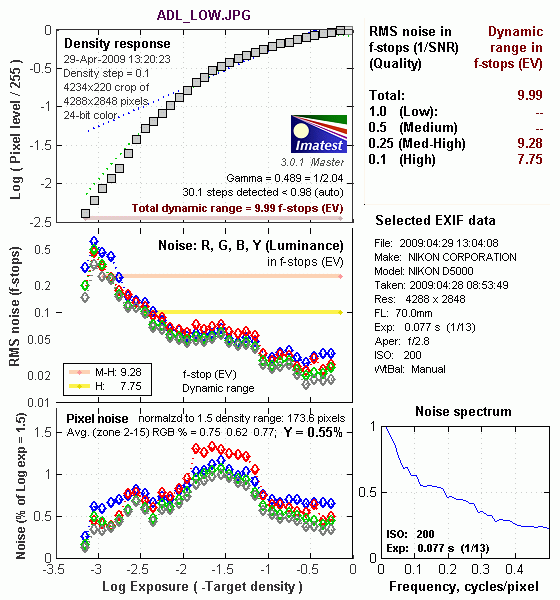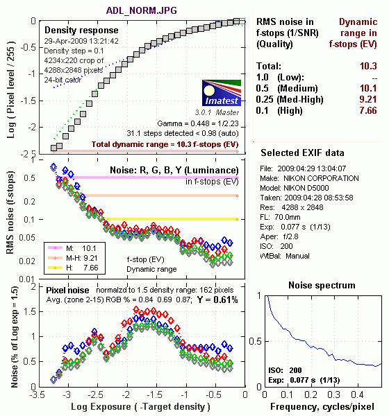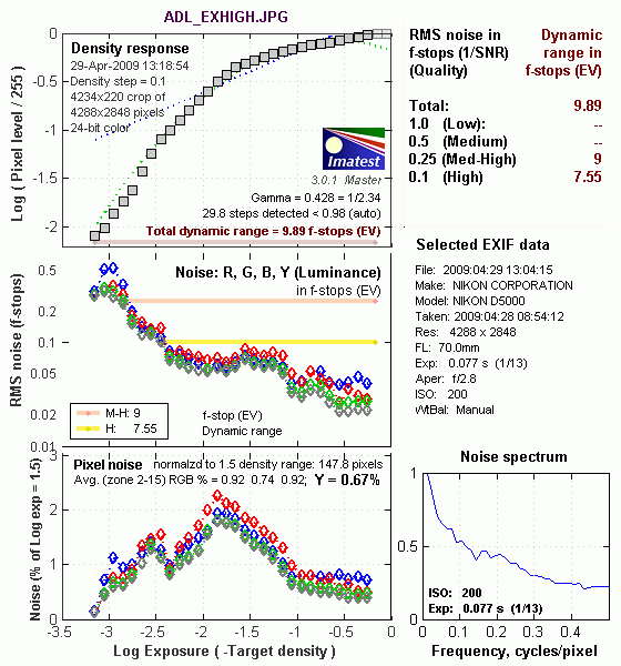 What makes most sense then, is to specify useful dynamic range in terms of the point at which image noise reaches some agreed-upon threshold. To this end, Imatest computes a number of different dynamic range measurements, based on a variety of image noise thresholds. The noise thresholds are specified in terms of f-stops of equivalent luminance variation in the final image file, and dynamic range is computed for noise thresholds of 1.0 (low image quality), 0.5 (medium image quality), 0.25 (medium-high image quality) and 0.1 (high image quality). For most photographers and most applications, the noise thresholds of 0.5 and 0.25 f-stops are probably the most relevant to the production of acceptable-quality finished images, but many noise-sensitive shooters will insist on the 0.1 f-stop limit for their most critical work.