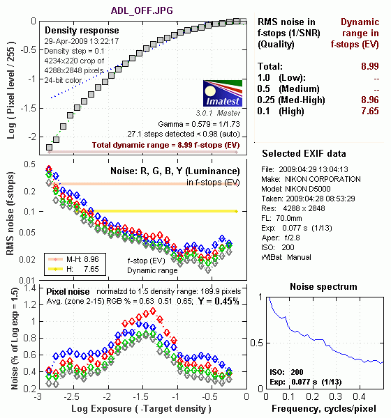 The image below shows the test results from Imatest for an in-camera JPEG file from the Nikon D5000 with a nominally-exposed density step target (Stouffer 4110), and the D5000's settings at their default positions, where Active D-Lighting is set to Off.