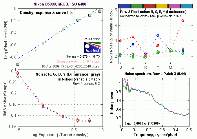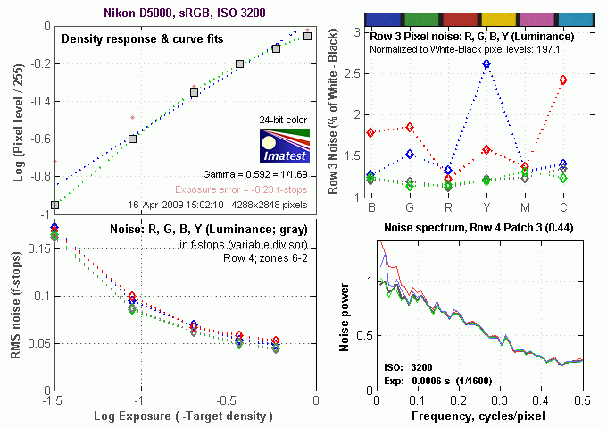 Above is the same set of noise data at ISO 3,200. Here, we can see the overall noise energy has gone up somewhat (the area under the curves is larger), and the Noise Spectrum graph is still shifted toward the left-hand, lower-frequency side. This time, the red channel has slightly more noise energy at lowest frequencies, though the channels are more closely matched than at ISOs 100 and 200, an effect of the D5000's default high ISO noise reduction.