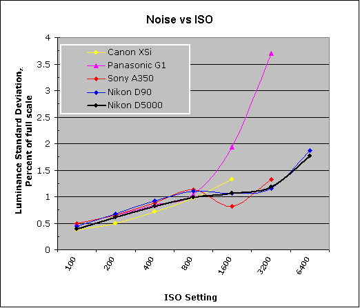 One thing that's going on here though, is that we tested each camera at its lowest (base) ISO setting, which should produce best-case noise levels. This is in fact what many photographers will be most interested in, but it does perhaps place some of the Nikons (like the D40 and D5000) at a disadvantage, as their base ISO setting is 200, as compared to the ISO 100 settings available on most other models.