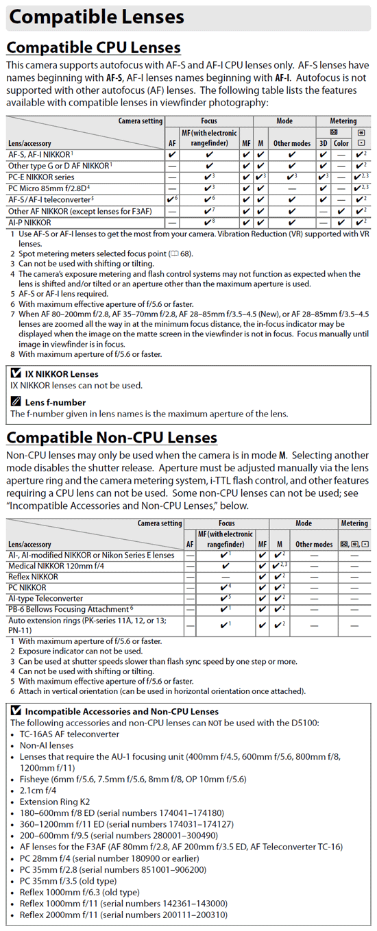 The tables below (courtesy Nikon Inc.) tell the full story of lens compatibility for the Nikon D5100.