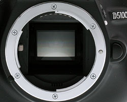 The Nikon D5100 shares the same Multi-CAM 1000 phase-detection autofocus sensor module that's previously appeared in the D3000, D3100, and D5000, among others. The Multi-CAM 1000 module offers 11 focusing points, of which the center point is a cross-type sensor. As in the D5000, the approximate AF point locations are indicated with faint black markings, illuminated by single red LEDs. The LED indications, albeit very small, are bright and easy to see, and thankfully none of them "bleed" into other points, an issue we'd previously seen with the D3100.