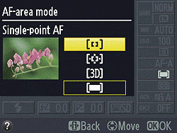 Single-servo AF is best for stationary objects, as the camera sets focus only once when the Shutter button is first pressed halfway (or if the AF-ON function is set, when the AE-L / AF-L button is pressed). Continuous-servo AF and the Live View / movie Full-time servo AF both mean that the camera continuously adjusts the focus, as long as the Shutter button is halfway pressed, suitable for moving objects. In Auto-servo AF mode, the camera begins focus operations in Single-servo mode, but switches to Continuous-servo AF if it detects motion within the active AF area.