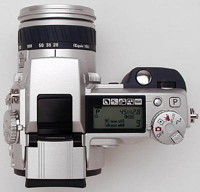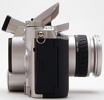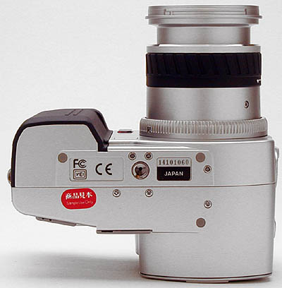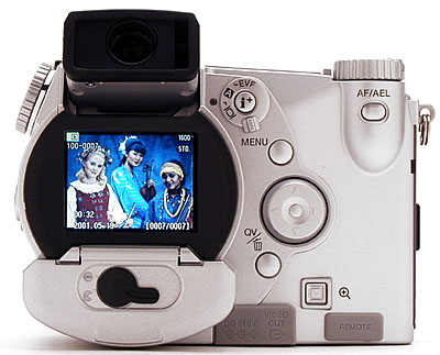 One of the most impressive features, however, is the Digital Hyper Viewfinder. While technically an Electronic Viewfinder (EVF) -- a miniature version of the larger rear LCD display (complete with information overlays) -- this viewfinder incorporates a sophisticated "reflective ferroelectric" LCD design, with a stated visual resolution equivalent to 220,000 pixels. We were amazed by the display quality, much better than we're accustomed to seeing in EVFs, with a remarkably smooth, sharp, and clear image, even in low light (!), where most EVFs fail miserably. In addition to better quality, the Digital Hyper Viewfinder offers unique flexibility, with a variable position eyepiece that can be tilted up as much as 90 degrees.