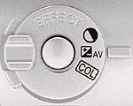 The left side of the camera features a host of camera controls, including the Function dial, Effects dial, Auto/Manual Focus button, and Macro button (on the side of the lens). The Function dial, located at the top of the panel, controls the image Size and Quality, Exposure mode, Drive mode (Self-Timer, Continuous Shooting, etc.), White Balance, and ISO. The Effects button allows users to adjust Contrast, Exposure Compensation, and Color Saturation. The Focus button simply switches between Auto and Manual focus modes. A Macro switch on the lens barrel can only be engaged when the lens is in full telephoto position. The second neck strap attachment eyelet is at the top next to the Function dial. Also visible on this side, on the very tip of the electronic viewfinder eyepiece, is the Diopter adjustment dial, which adjusts the viewfinder display to accommodate eyeglass wearers.