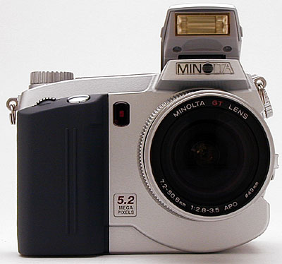 The camera's front panel houses the Minolta GT 7x Zoom lens, Self-Timer light, and the front of the pop-up flash compartment. Encircling the lens are two adjustment rings: a rubberized optical zoom grip on the front end, and a notched Manual Focus ring at the base of the lens. A set of 49mm filter threads on the inside lip of the zoom lens accommodates filters and conversion kit accessories. A second set of filter threads, on the outside edge of the lens, accommodates the accessory lens hood. Also visible from the front of the camera are the Shutter button and Selector wheel, located at the top of the hand grip. Two vertical, raised ridges on the front of the hand grip give fingers a place to grasp as they curl around the grip.