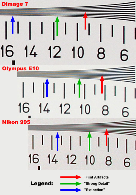 The illustration above shows samples cropped from our laboratory resolution-target shots, taken with three high-end digicams: The 5-megapixel Dimage 7, the 4-megapixel Olympus E-10, and the 3.3-megapixel Nikon Coolpix 995. Our normal practice is to apply no adjustment to any of the camera images we shoot, but in this case, we've tone-adjusted the shots from the various cameras, so they'd match in brightness, contrast, and color cast. - This was important, as differences in contrast can significantly affect perceived resolution, and this close juxtaposition would have exaggerated the effect of any differences.