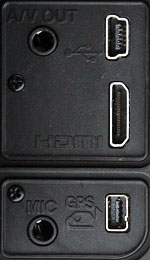 Connectivity. The top jack is for composite video / mono audio output. Beneath is a Type-C Mini HDMI connector, which supports 1080i, 720p, 576p or 480p digital video with stereo digital audio, and offers both automatic resolution sensing, and Consumer Electronics Control support. At bottom left is a 3.5mm stereo microphone jack. The adjacent GPS port allows geotagging of still images, and isn't applicable to video capture.