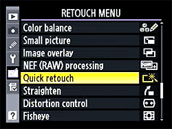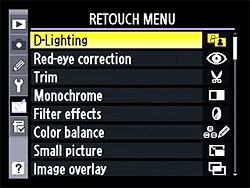 The Retouch Menu now spans two menu screens, with many more features than even the just-released pro-level D700 has. | |
