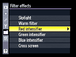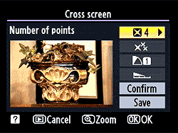The Filter Effects retouch option carries the four new options we saw on the D60: Red/Green/Blue intensifiers and Cross Screen (for creating star effects around strong point highlights.) | Cross Screen options include number of points on the highlight stars, number of stars (threshold for highlights to trigger star creation), angle of star rays, and length of rays. A little kitchy in practice (a little goes a long ways), but fun for some shots. |
