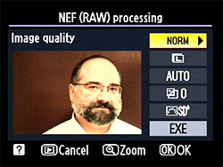In-camera RAW processing is a feature we've seen on Nikon cameras for a little while now, but it deserves mentioning for its completeness: Pretty much any color or tone adjustment you could make when taking the original shot is available when developing NEF RAW files into JPEGs after the fact. Options include JPEG quality, image size, white balance, exposure compensation, and Picture Control. (Presumably including any adjustments you've made to the camera's individual Picture Control settings. | |