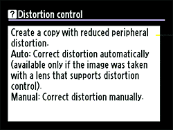 And speaking of useful, the Nikon D90 also lets you correct pincushion and barrel distortion (within limits) right on the camera's back panel. If you have a lens that the camera knows about (presumably most Nikkor lenses), the camera can correct the distortion automatically. | |