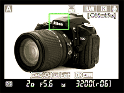 The Live-View display on the Nikon D90 provides a fair bit of exposure information, including shutter speed, aperture, exposure compensation, ISO, card space remaining, image size/compression, white balance setting, program mode, etc. | As noted elsewhere, Contrast-Detect autofocus is the only focus mode available in Live View. The advantage though, is you can position the focus area wherever you want in the image. Here, we've moved it up to center on the Nikon logo on the camera. The focus rectangle turns green when focus is locked. |