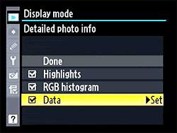 Histogram displays are pretty standard these days. Here, we see histograms for brightness (luminance) and the red, green, and blue channels separately. | Here's something you may not have seen on a Nikon DSLR before: The histogram updates as you zoom in on the image! - We've long wondered why camera makers hadn't done this; now Nikon has. Cool! |