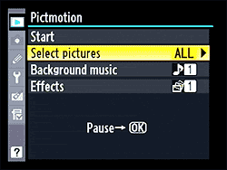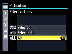 Pictmotion is Nikon's name for slide shows synchronized with music and with "Ken Burns" effect animation. On the D90, it's shown as a separate menu item, to distinguish it from common fixed-interval slide shows. | You can select individual photos, all the images shot on a given date, or all images on the memory card. |