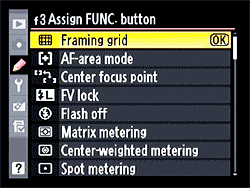 The icon bar along the bottom provides quick access to items otherwise buried in the menu system. | The Nikon D90 gives you a lot of choices for what function to assign to the front-panel Func button. |