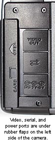 Batteries load easily in the battery compartment in the bottom of the camera, and the AC adapter, video out, and serial ports are neatly tucked into the left-hand side of the camera, protected by small plastic flaps, but readily accessible.