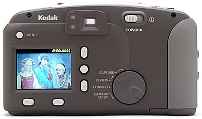 The 1.8-inch LCD can be used to preview an image in Capture mode, or review images in Review mode. The LCD is equipped with a brightness adjustment, a small rotary control projecting from the rear of the camera just below and to the left of the mode dial, to adjust LCD viewing for your particular needs. (Note that this doesn't appear to be a "true" brightness control, in that it seems to just vary the display contrast, rather than the brightness of the LCD's backlight.) The "live" images on the LCD are bright and sharp, with a fairly high refresh rate, albeit not as fast as some cameras we've tested. Regardless, the LCD is still very helpful when framing your subjects, or when experimenting with what you shot will look like if captured in sepia-tone, or black and white mode. In "viewfinder" mode, the DC3400's LCD shows the 100% accuracy we've come to appreciate in the Kodak digital camera line. (100% viewfinder accuracy is handy for framing critical shots, but surprisingly rare among the digital cameras we've tested.)