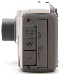 The body, at 5.2 x 2.0 x 3.0 inches (133 x 51 x 76 mm), consists of metallized plastic and has a nice "grip" area on the right-hand side. The power switch is easily activated with your thumb while holding the camera in your right hand. The shutter button is readily accessible without stretching your finger, which makes for easy, one-hand capturing of images. The camera mode dial on the rear of the camera is easily rotated with the thumb of your right hand, again facilitating one-handed shooting. The picture card compartment is also easy to access on the left-hand side of the camera, and it's equally easy to load or eject the 10 megabyte picture card, even when the camera is mounted on a tripod.