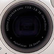 Kodak rates the DC3400 at an equivalent ISO speed of 70 with a maximum aperture setting of F/3 in wide angle mode, and F/3.8 in telephoto mode. This is somewhat lower sensitivity than is common among digicams these days, making the DC3400 less suited to low light shooting than some models. The DC3400 includes an optical-glass lens that automatically focuses on your subject. Depressing and holding the shutter button half-way after framing your subject sets and locks in the auto focus prior to capture, allowing accurate focus for off-center subjects. (Center the subject, lock the focus, then re-frame the shot while still holding the shutter button down, before taking the picture.)