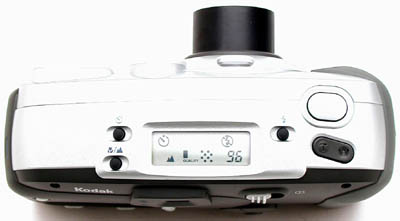 The top of the camera features a data readout LCD that displays information about the camera's current status, including the image size/quality settings, flash mode, macro and self-timer status, a number of shots remaining on the memory card at the current quality setting. Three buttons next to the readout let you enable the self timer, select normal, infinity, or macro focusing, and change the flash modes. The shutter button and toggle control for the zoom lens are on the right side of the top panel.