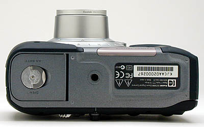 Batteries load easily in the battery compartment in the bottom of the camera, and the AC adapter, video out, and serial ports are nicely tucked into the left-hand side of the camera (behind a sealed, latching cover hatch) for easy accessibility. The CompactFlash memory card is also accessed through this same hatch.